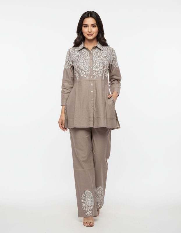 Ethnic Wear (Lehengas, Salwar Suits)₹1,999.00Original price was: ₹1,999.00.₹1,399.00Current price is: ₹1,399.00.zara brown and white abstract printed peplum shirt with matching ankle-length pant