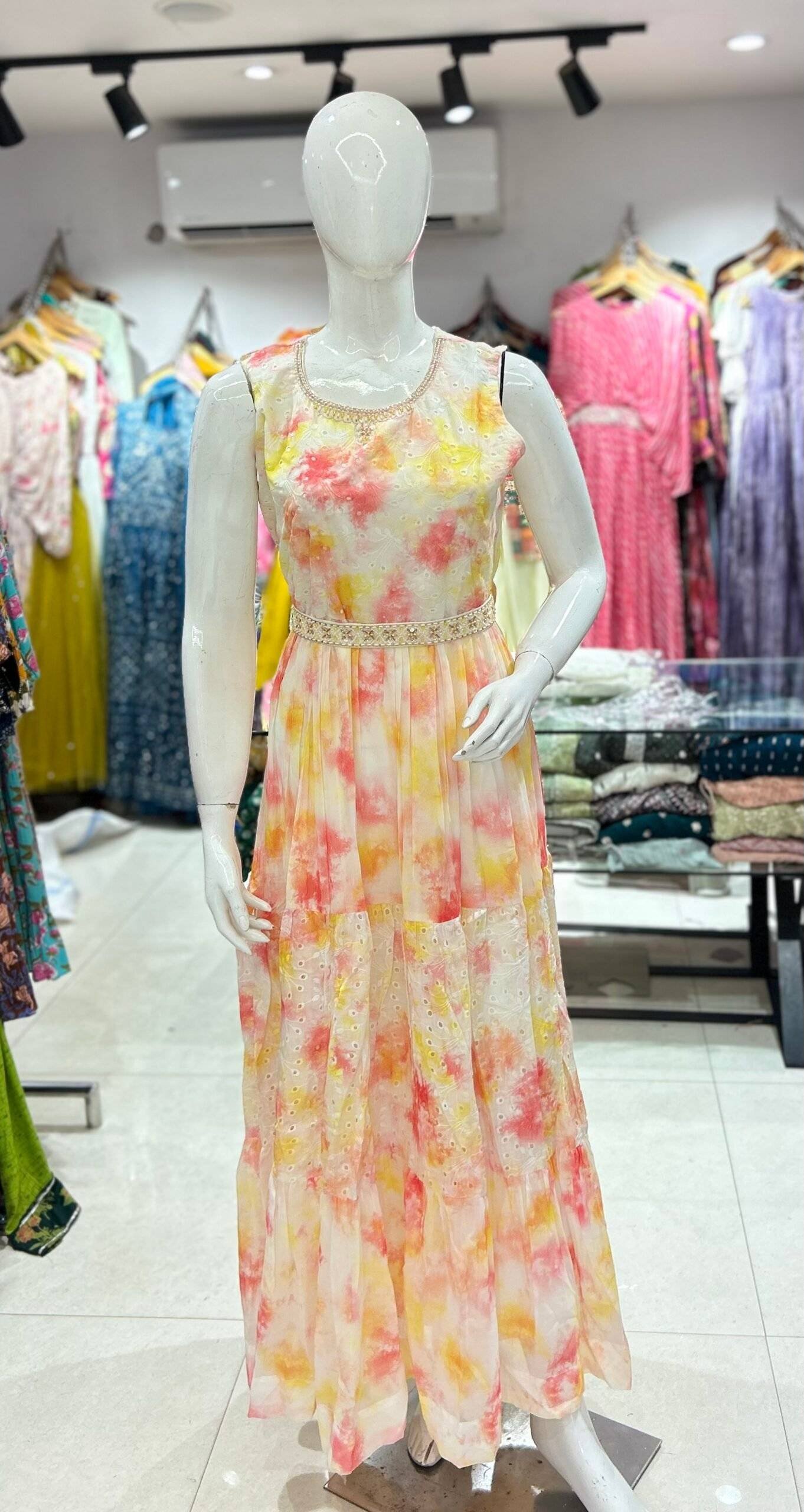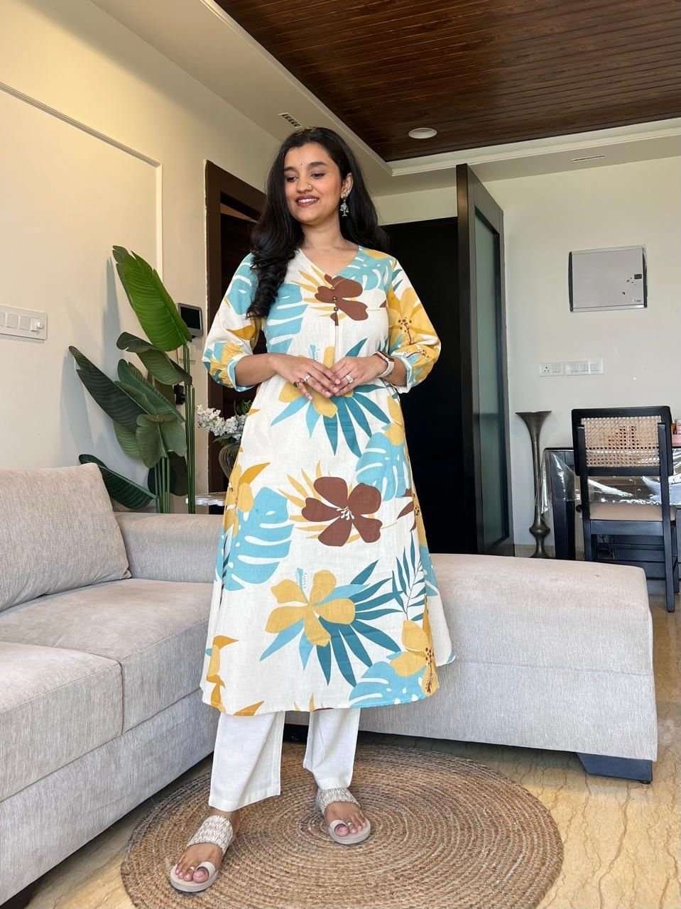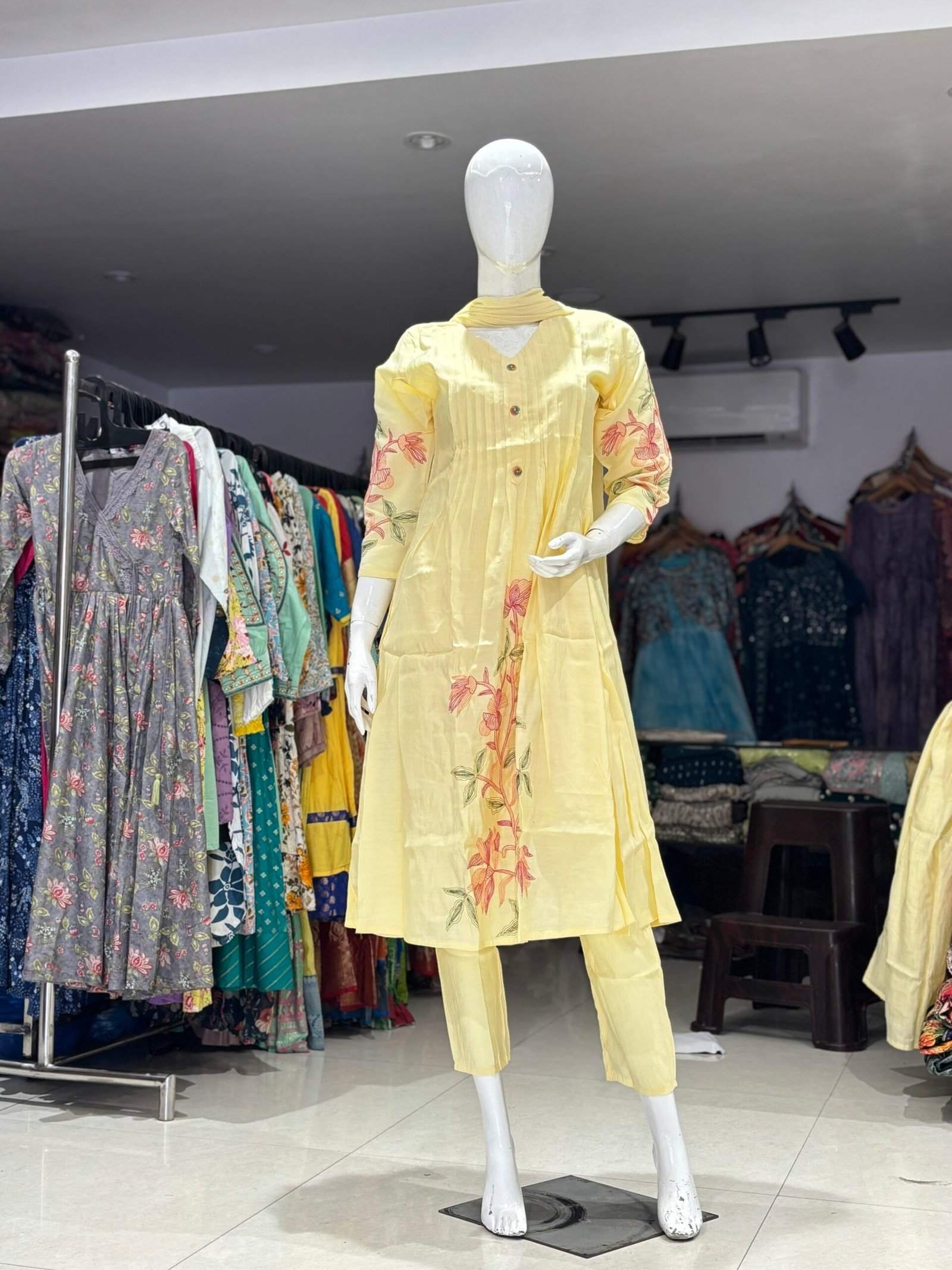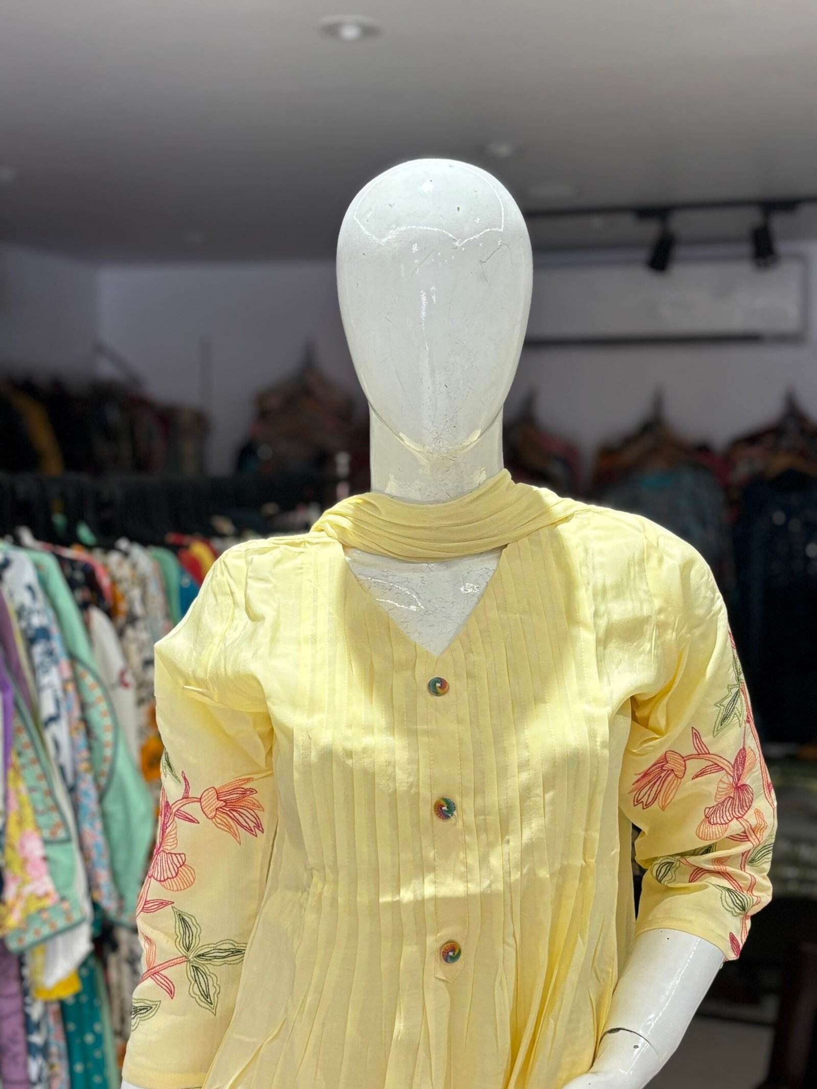 Yellow to Mint Green, Floral Embroidered Button-Down Cotton Suit