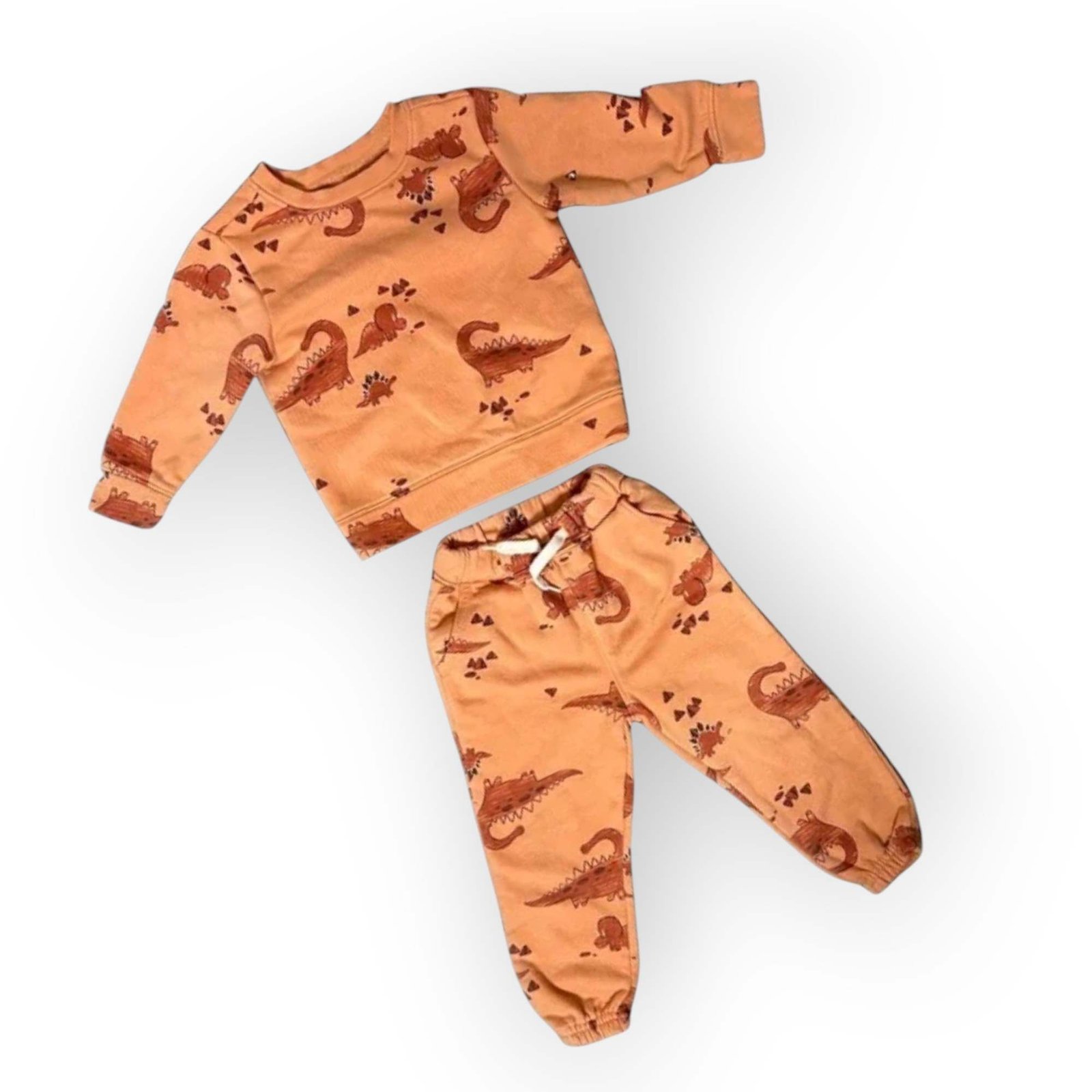 Charming two-piece set for kids featuring an all-over dinosaur print. Includes a cozy sweatshirt and comfy joggers, perfect for play and lounging.