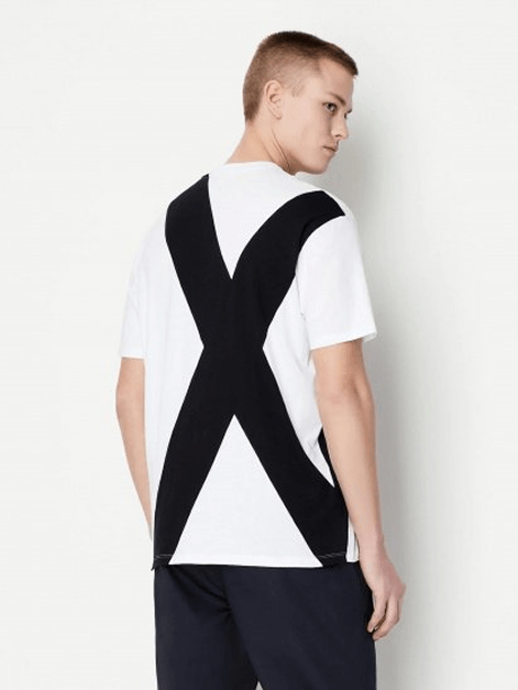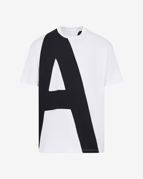 A white short-sleeve t-shirt with a large black letter “A” printed diagonally across the front, featuring a crew neck and a relaxed fit.
