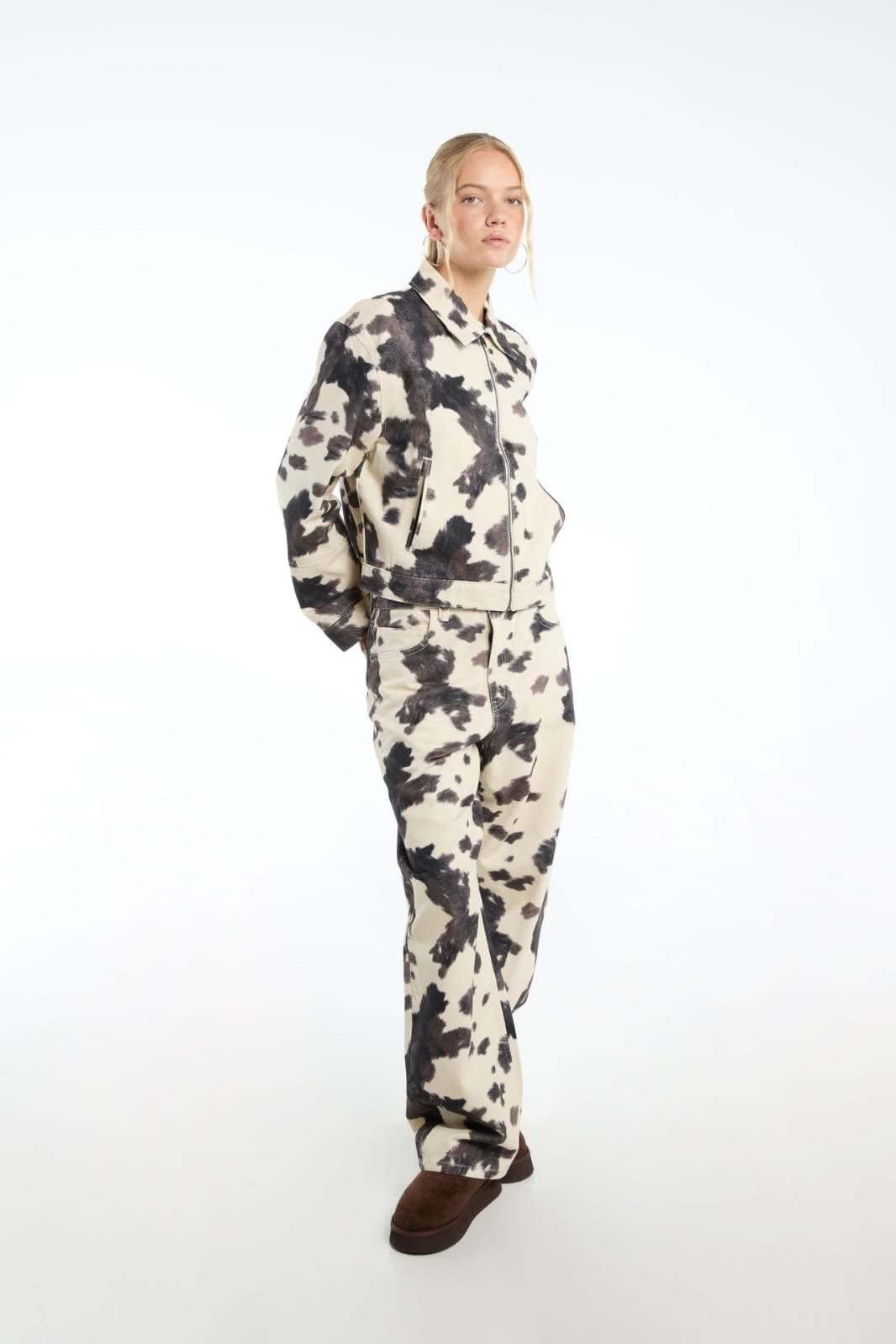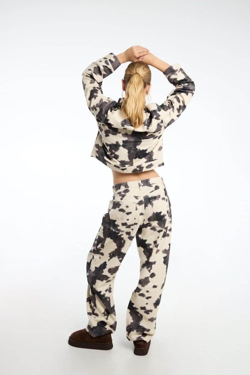 This image shows a person modeling a matching cow print jacket The individual in the image is a non-celebrity, and no personal details will be provided per safety policy.