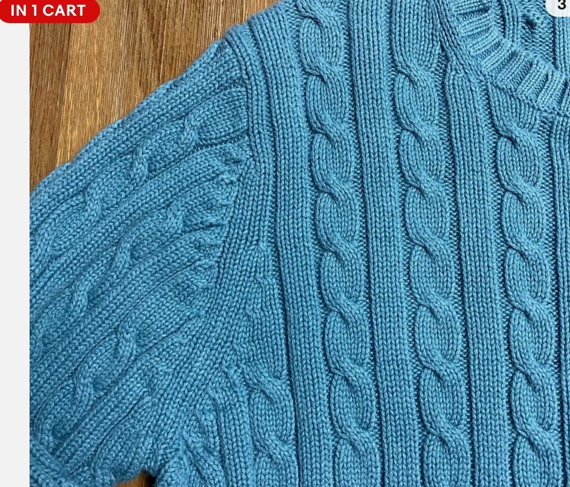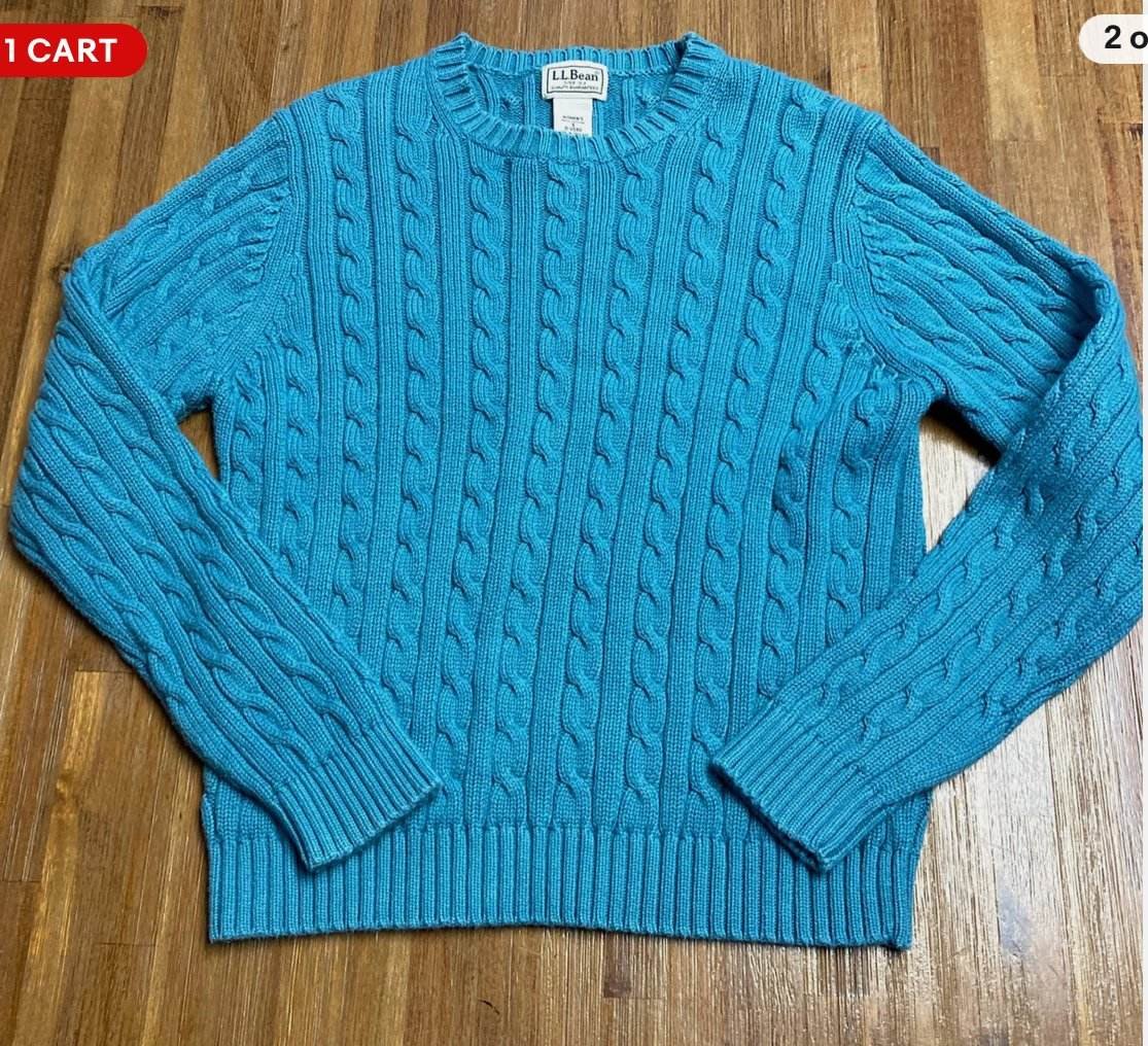 This is a vintage L.L.Bean women’s crew neck cable knit sweater in a teal or blue color. It appears to be made of 100% cotton.