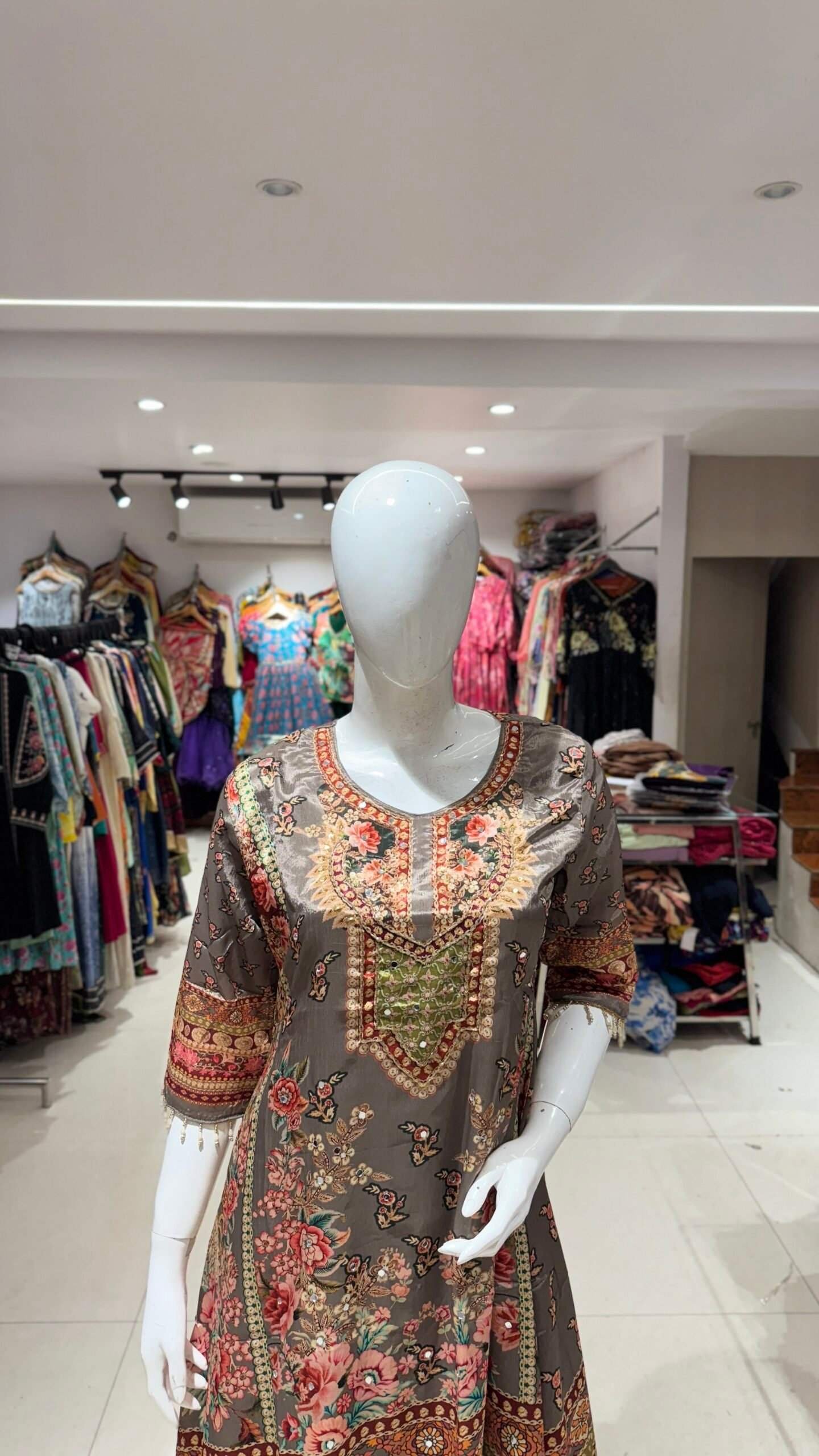 - Style and Design: The kurti features a prominent floral print throughout, complemented by detailed Zari work and embellishments around the neckline and along the three-quarter sleeves. The overall design suggests a blend of traditional Indian craftsmanship with a contemporary aesthetic.