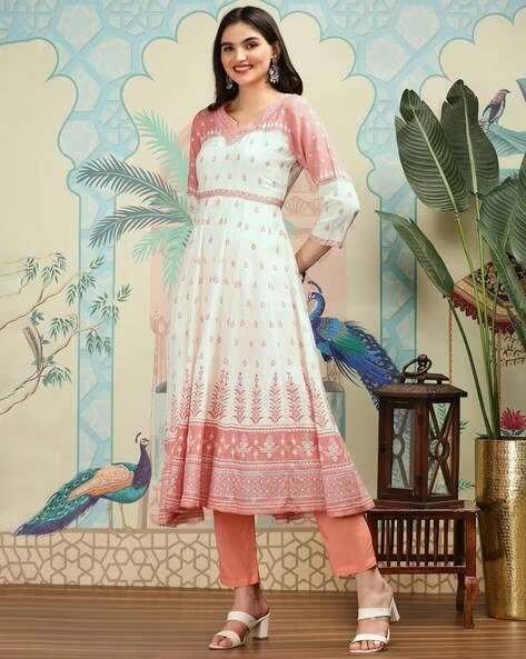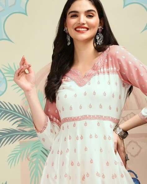 - Design & Color: The kurta features a lovely pink and white floral print, often described as having a notched neck or a round neck with detailed embroidery or prints.