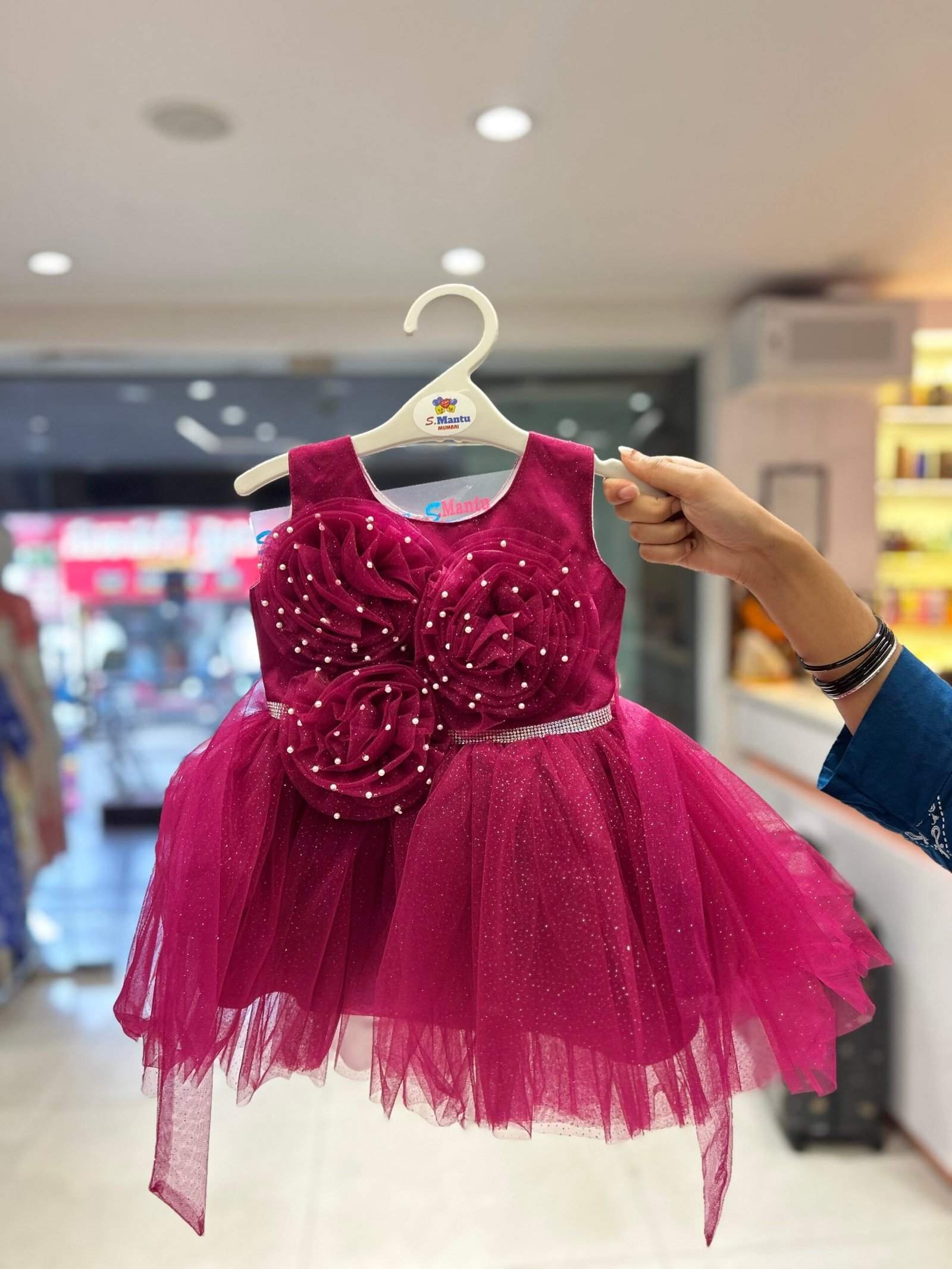 a fuchsia-colored, sleeveless net frock for a baby girl, featuring a large floral applique on the bodice and a shimmering skirt.pink net party frock for baby girls. The dress features a large floral applique on the bodice with pearl details, a crystal belt, and a glittery, ruffled tulle skirt.