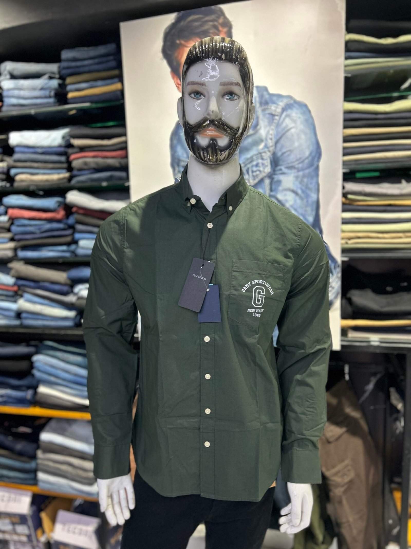 in green, featuring a “Gant Sportswear New Haven 1949” embroidered logo on the chest pocket. Gant, a brand founded in New Haven, Connecticut in 1949, is known for its classic American sportswear style with a focus on quality button-down shirts.