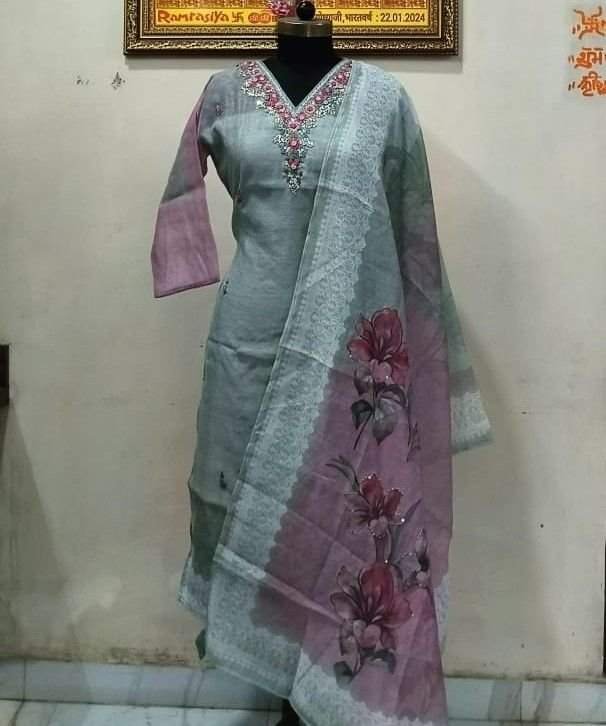 - Garment Type: It’s a three-piece set typically consisting of a kurta (tunic), bottom wear (likely salwar or pants), and a dupatta (scarf).