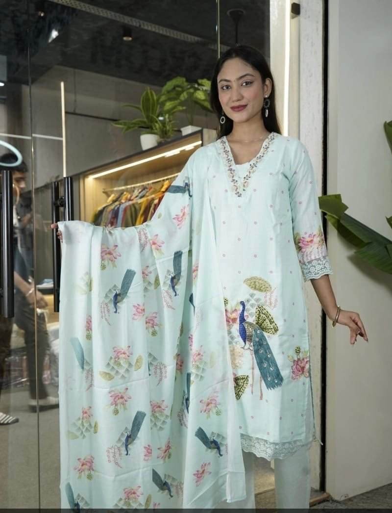 - Design: It features a V-neckline with delicate embroidery and beadwork accents, and a digitally printed design incorporating detailed peacock motifs and lotus patterns. The hems of the kurta and sleeves are finished with white lace trim.