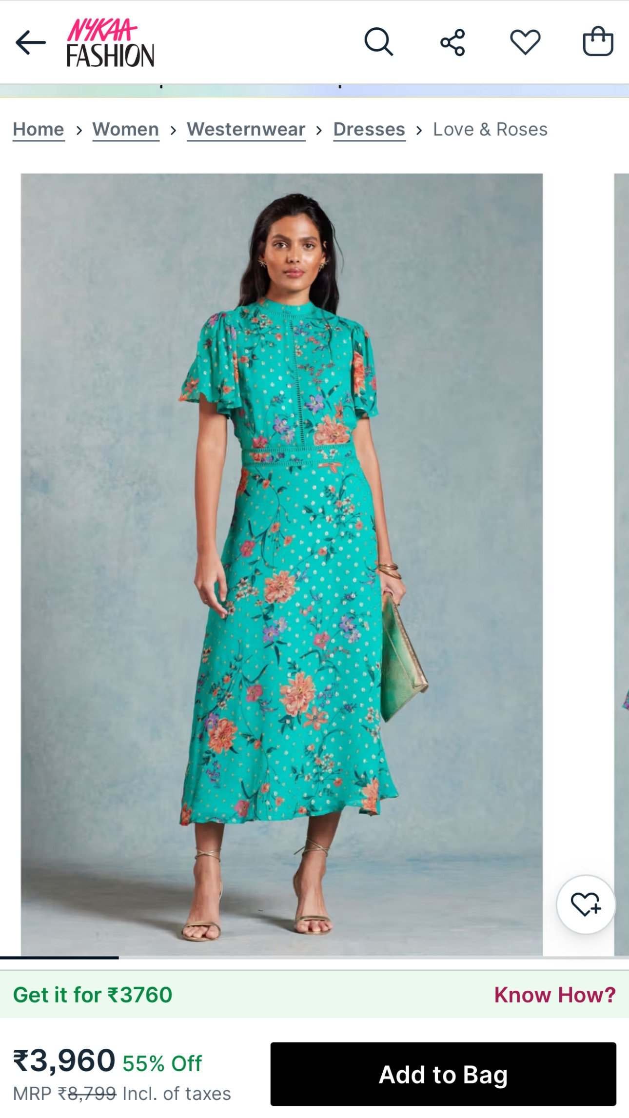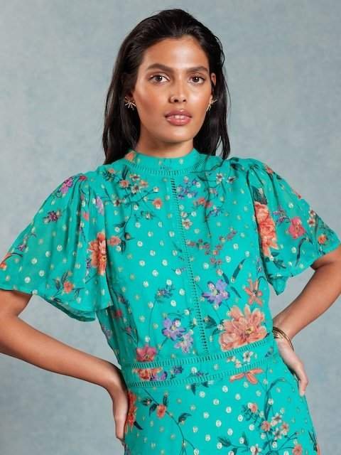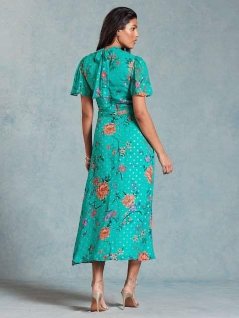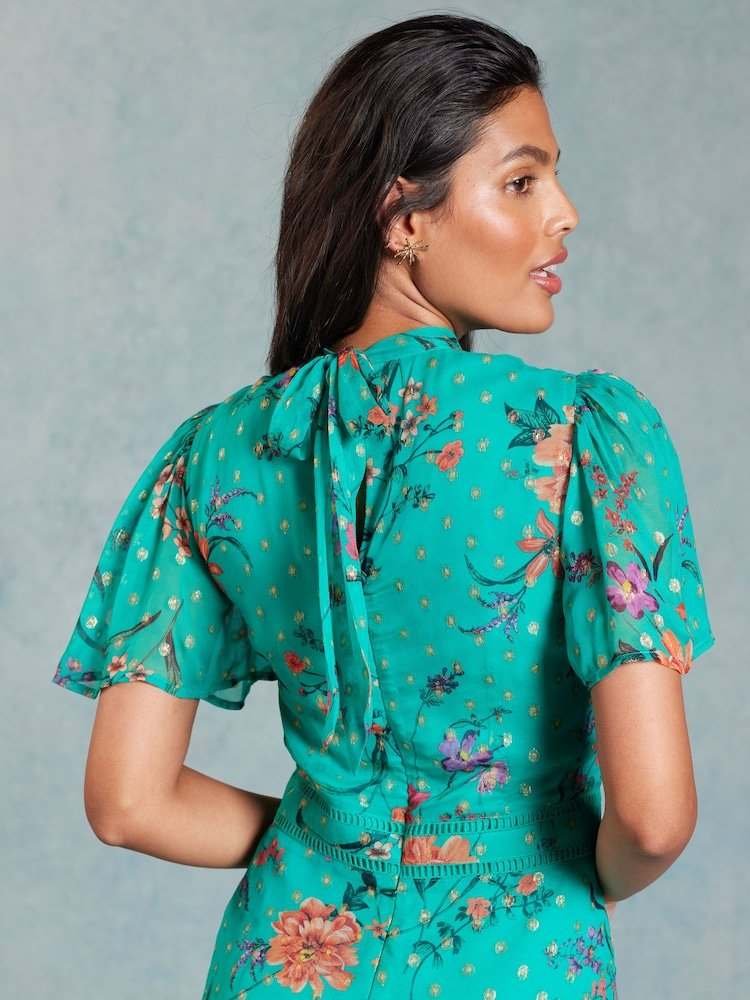 Love & Roses Green Floral Printed Metallic Flutter Sleeve Midi Dress