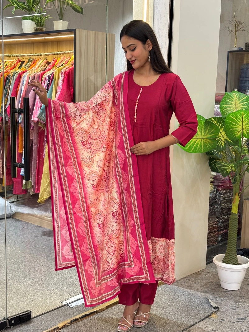 This image shows a person modeling a magenta ethnic suit set with a contrasting printed dupatta. The outfit features a straight-fit kurta and trousers, likely made from a silk blend or similar fabric, which is suitable for festive wear or functions.
