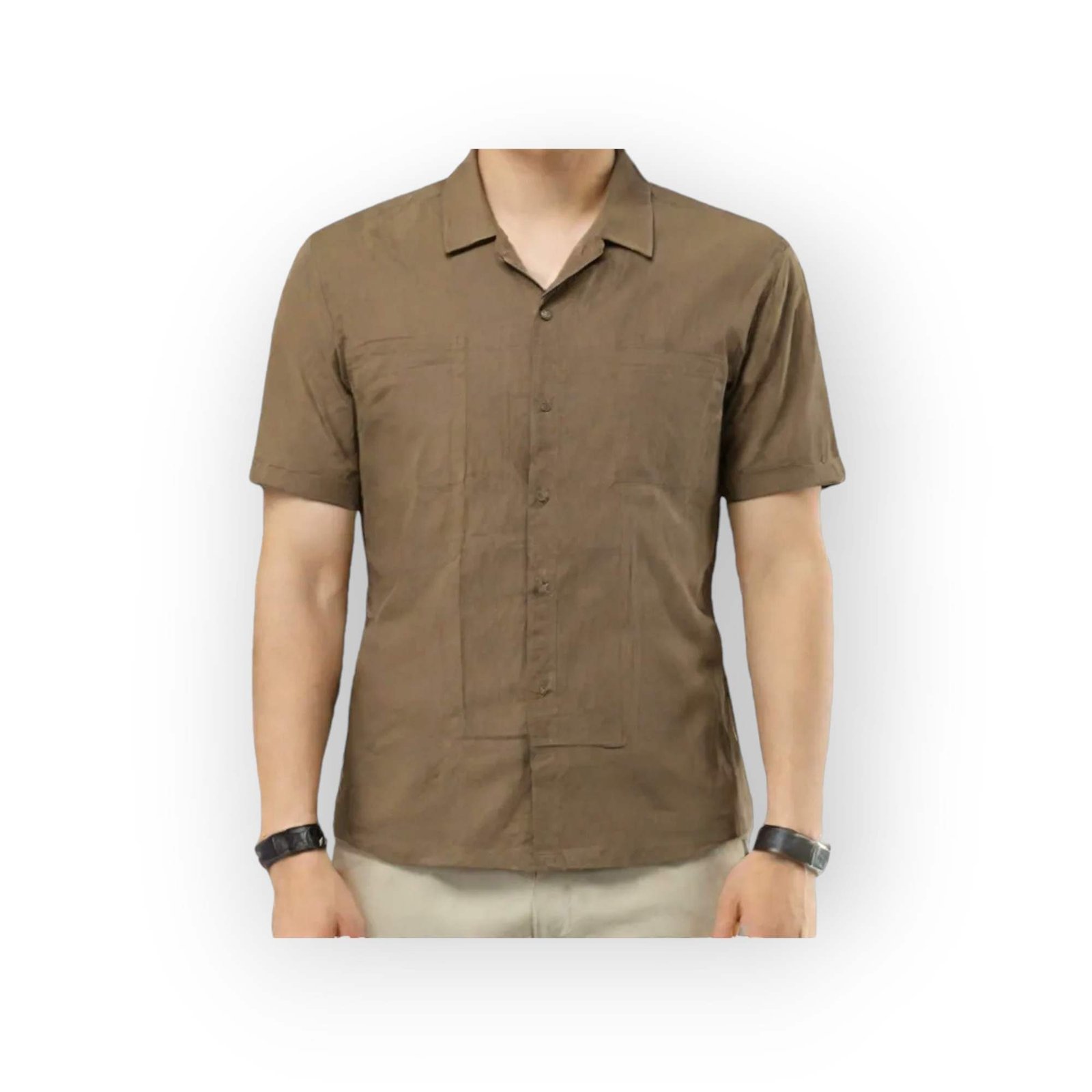 Men’s brown short sleeve button-up shirt with a relaxed fit and notched collar. Ideal for casual, everyday wear.