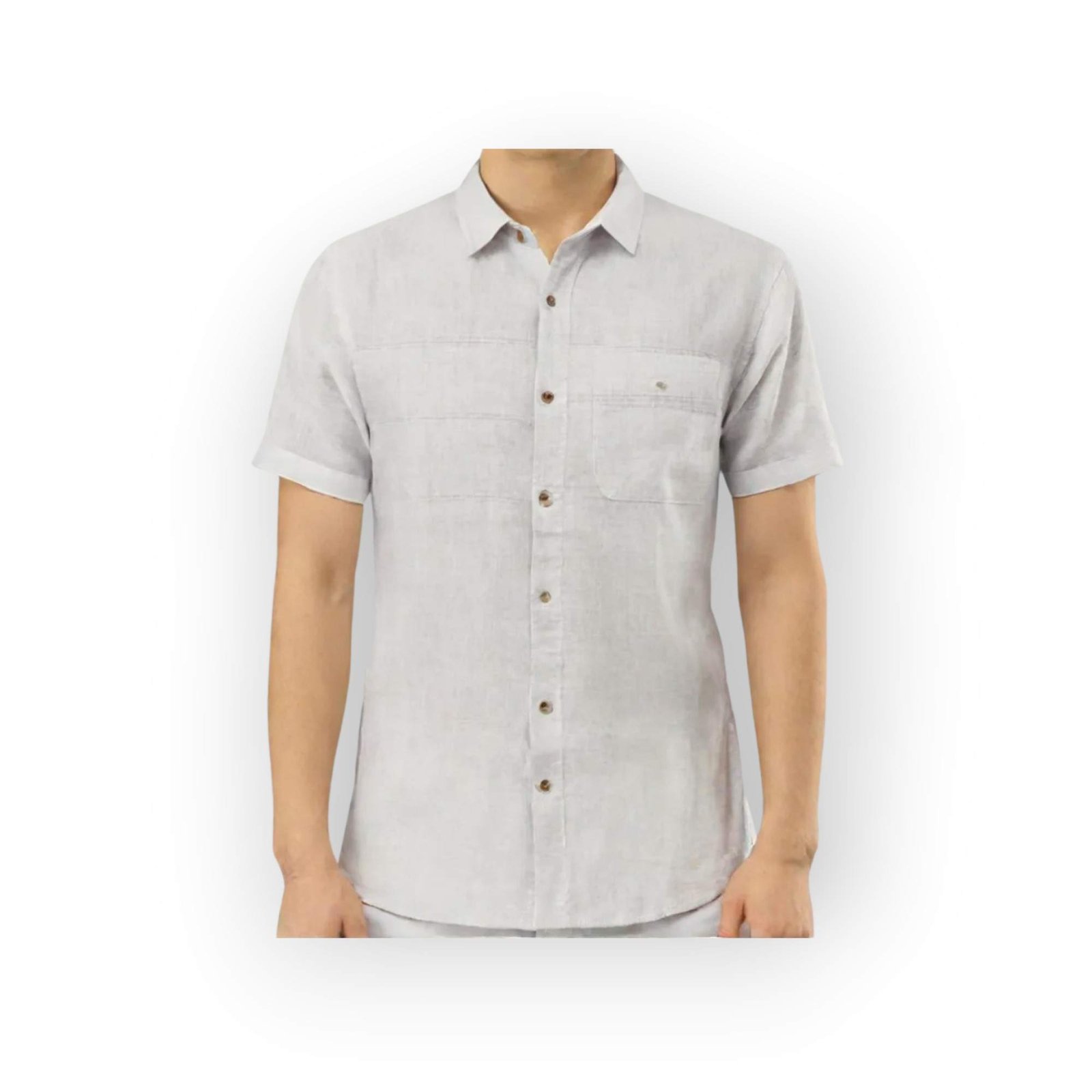 Stay cool and stylish with this men’s light grey short sleeve linen shirt, featuring chest button pockets and a relaxed fit. Perfect for summer outings and casual looks.