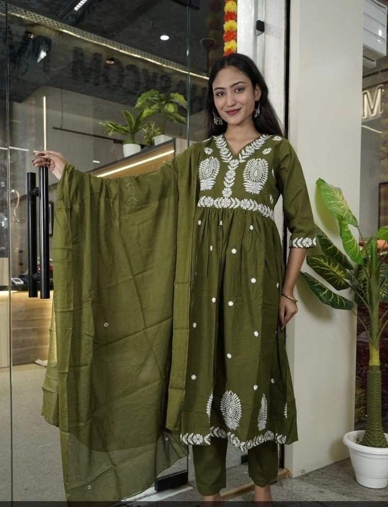 This image shows a person wearing a traditional olive green Indian kurta set featuring white thread embroidery. The ensemble includes an Anarkali-style kurta with a flared hem, a matching pair of trousers (pants), and a dupatta (scarf).