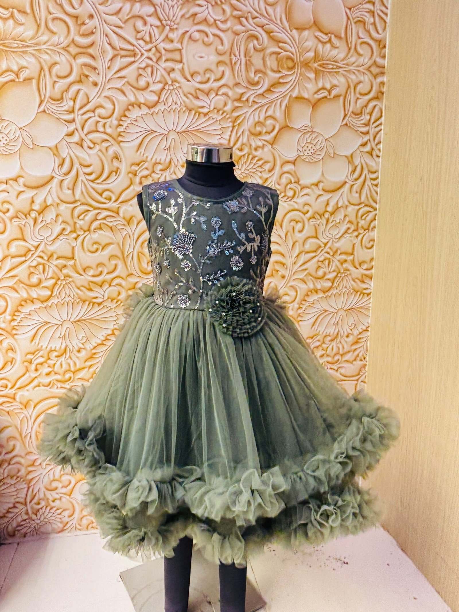 - NakshatraKids LLP: Provides a green tulle net handwork birthday frock with pearl accents and floral details, and an olive green handworked party gown.