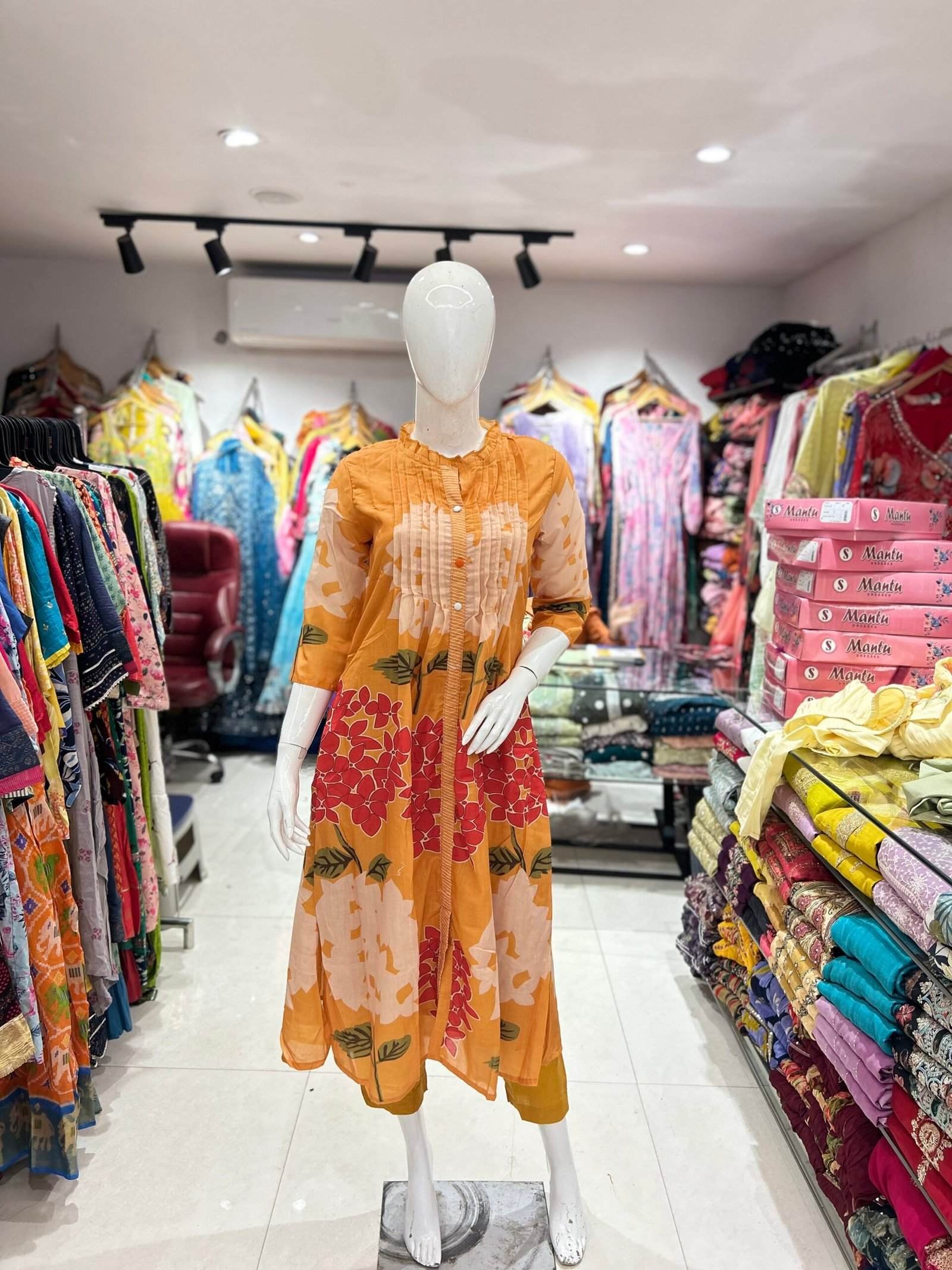 An orange and red floral long tunic top is featured in the image, characterized by a pleated neckline and a straight cut. It appears to be a kurti, a type of traditional Indian tunic. The fabric is likely cotton or a cotton blend, given its drape and print style, making it suitable for casual or semi-formal wear.
