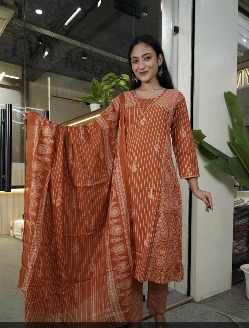 - Design: It features vertical stripes and traditional motifs (buta motifs) in a style similar to Jaipuri or Kalamkari prints. The neckline has simple white detailing.