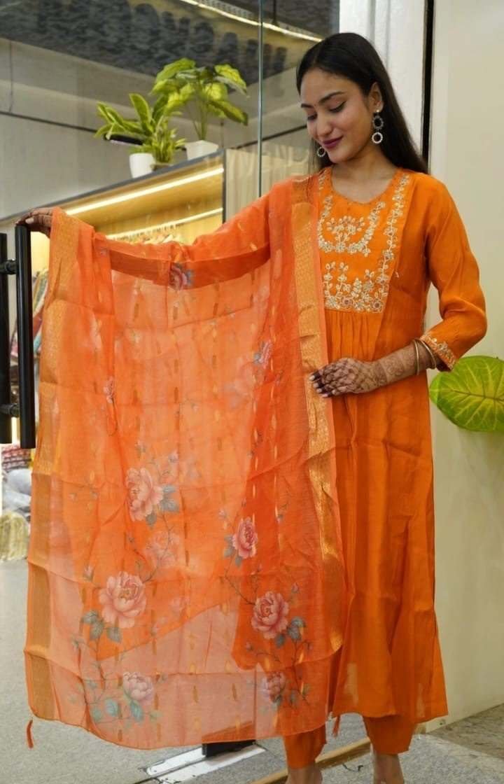 This image shows a person modeling an orange embroidered kurta set with a floral organza dupatta. The kurta features intricate embroidery around the neckline and has a straight fit with three-quarter sleeves. The outfit is a traditional Indian three-piece set, often made from a cotton or chanderi blend fabric, and is suitable for festive or party occasions.