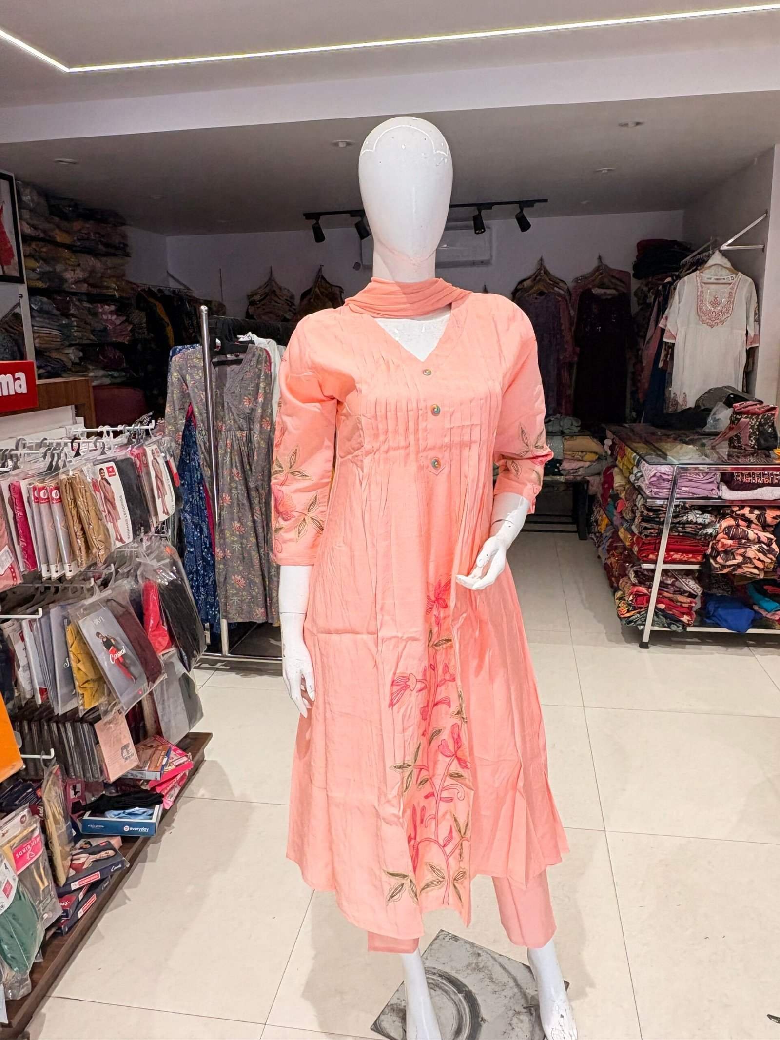 - Design: The kurta has a V-neckline and three-quarter sleeves, with pleats on the bodice and a flared, A-line silhouette. The pants are likely straight-cut or palazzo style.