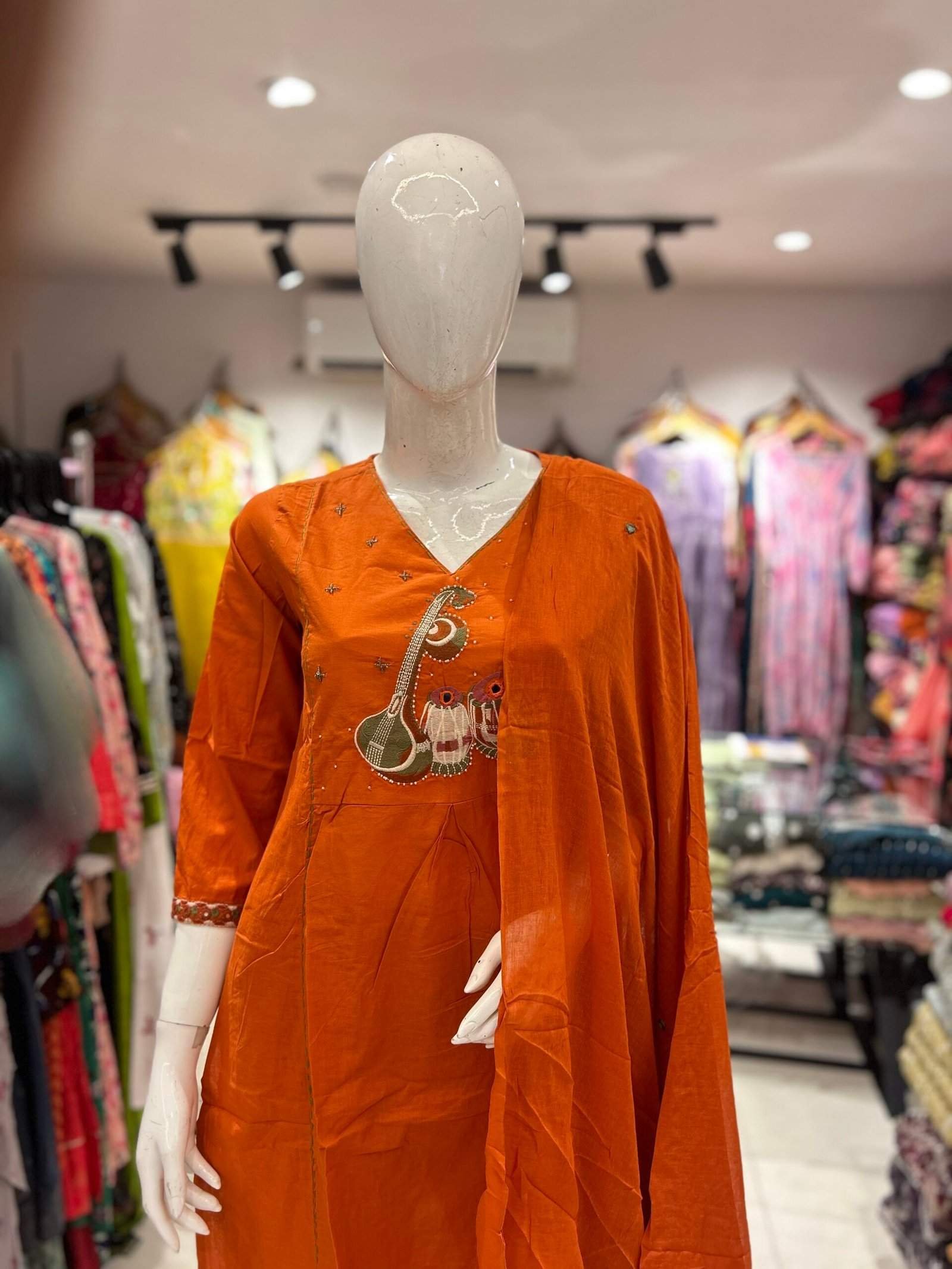An orange kurti with a veena embroidered design is a popular style of Indian ethnic wear. These outfits often feature intricate details and are considered suitable for festive occasions and celebrations.