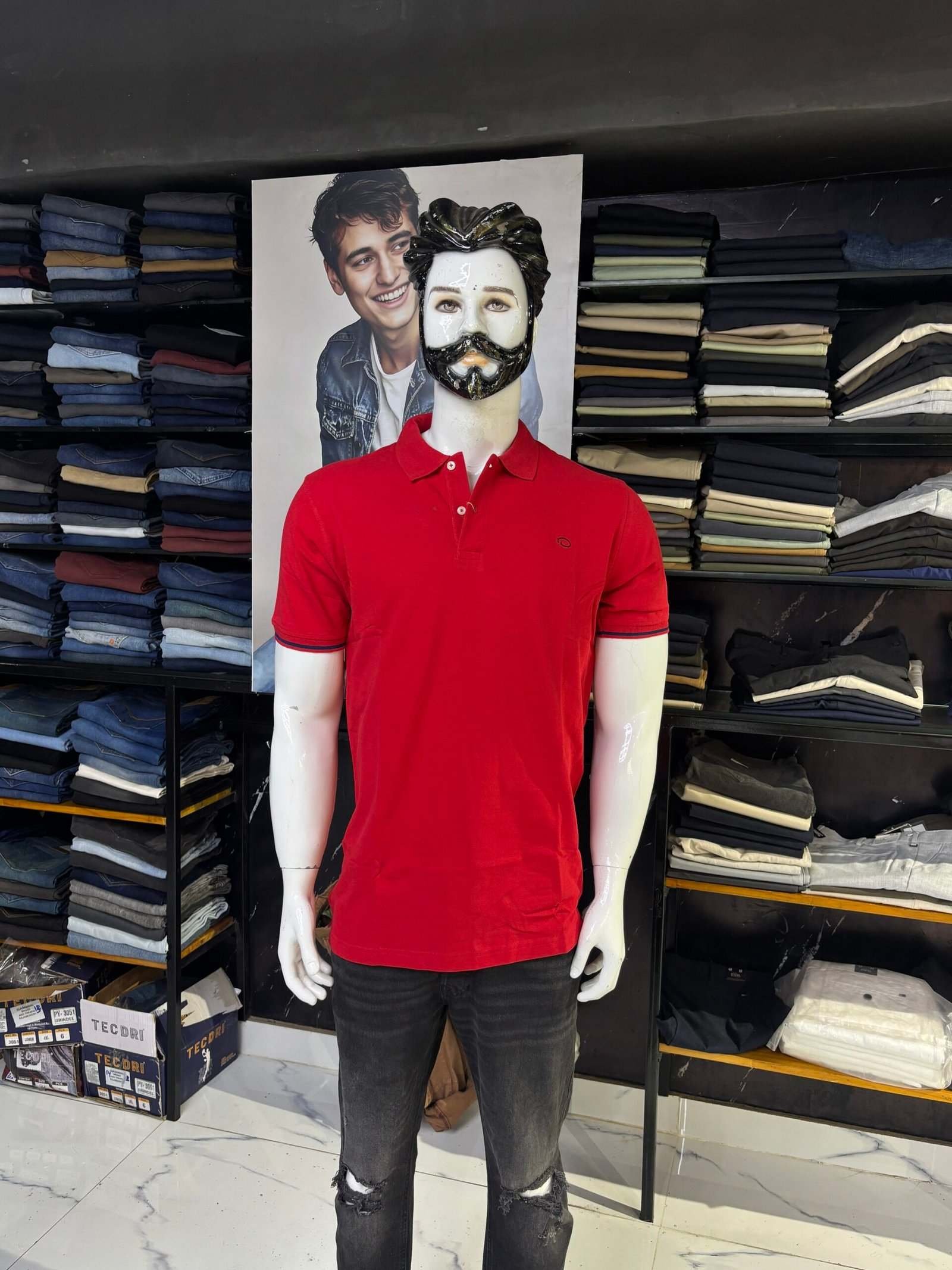 A red polo shirt is featured in the image, with a small logo on the chest and blue tipping on the collar and sleeves. The shirt is displayed on a mannequin in a store setting, with racks of clothing visible in the background.