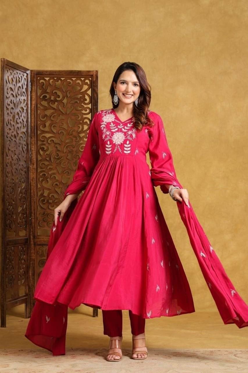 • Anarkali Kurta: This is the long, flowing top with a flared hem, characteristic of the Anarkali style, featuring embroidery around the neckline and scattered on the skirt portion.