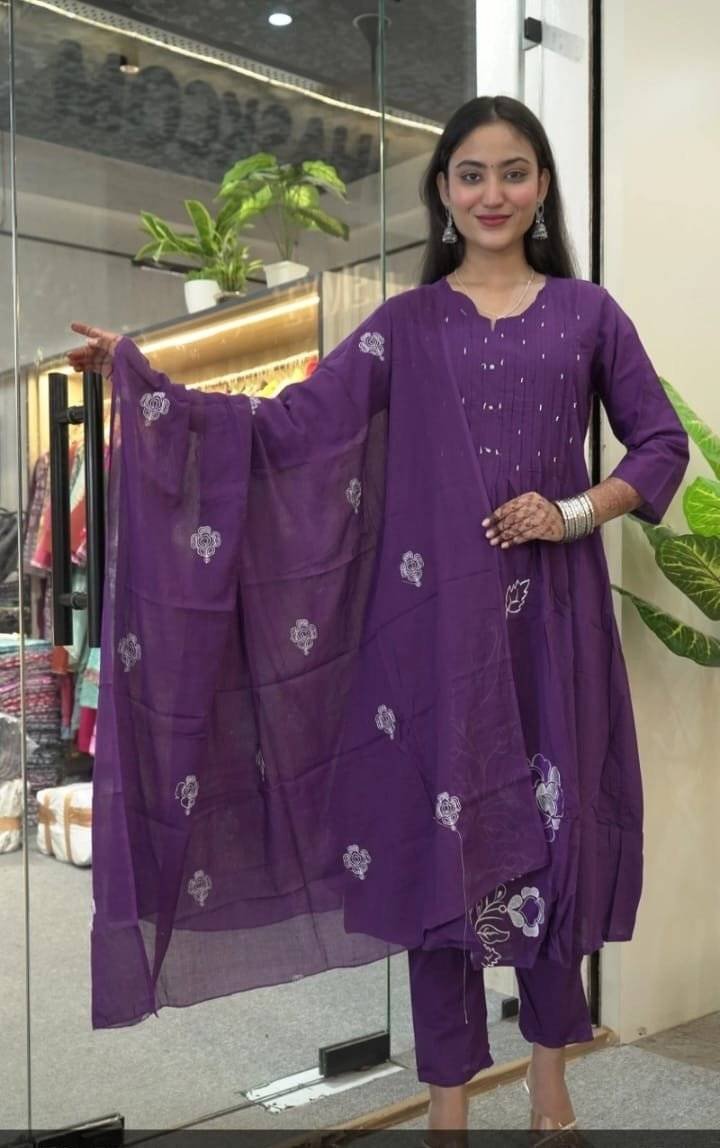 This image shows a person modeling a purple embroidered kurta set with a dupatta. The outfit features a long, A-line or anarkali-style kurta with white embroidery details on the yoke and hem, paired with matching trousers and a sheer dupatta.