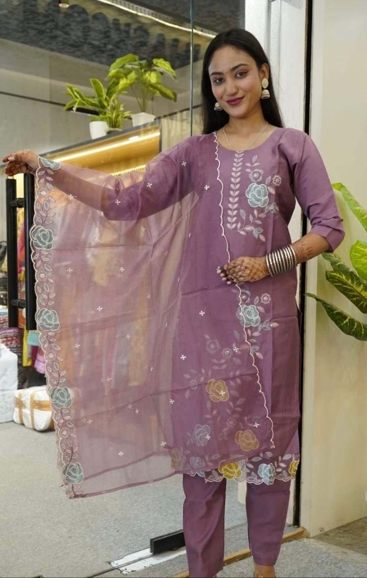 This image shows a woman wearing a purple embroidered suit set with an organza dupatta. This style is an Indian ethnic wear ensemble, which is a popular outfit for formal and casual occasions.
