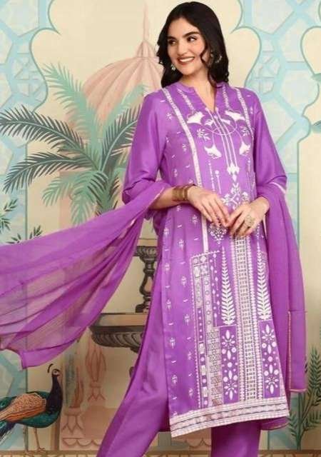 - Color & Embroidery: It’s a vibrant purple (or lilac/lavender) with prominent white or silver-toned embroidery, particularly on the kurta and dupatta.