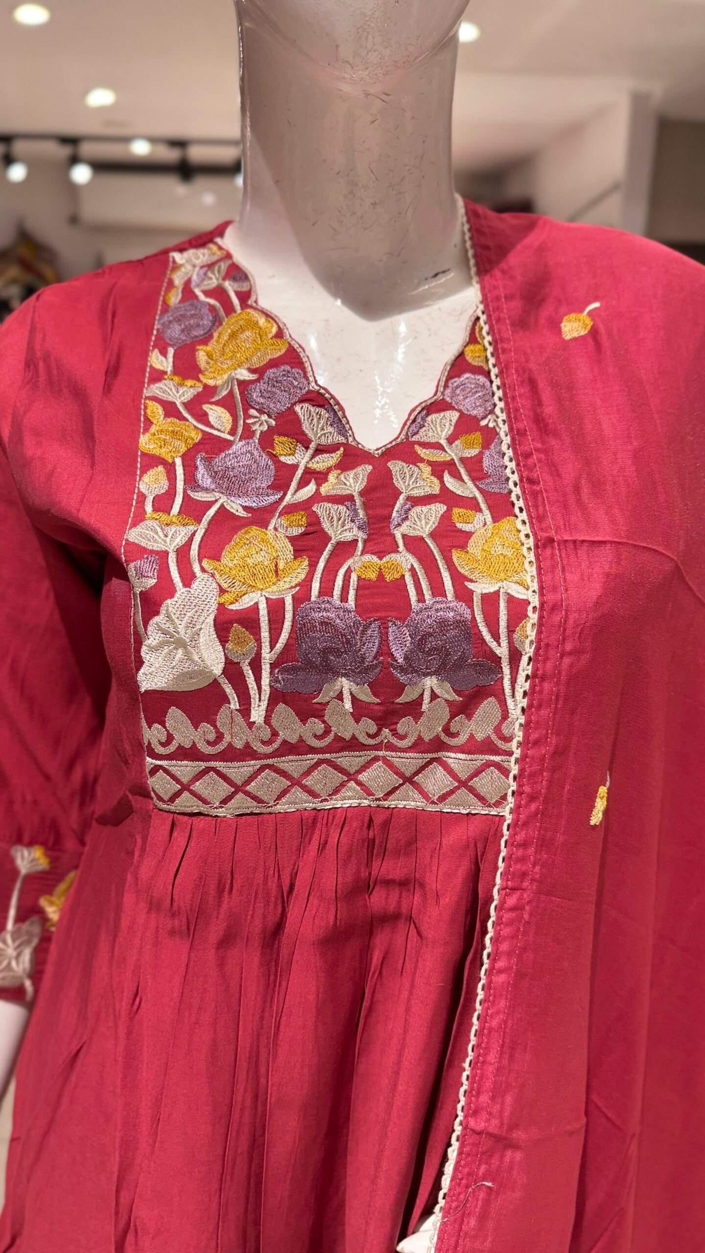 - Neckline and Embroidery: It features a V-neckline beautifully adorned with intricate floral embroidery in shades of yellow, purple, and white/cream, creating a striking contrast against the red fabric.