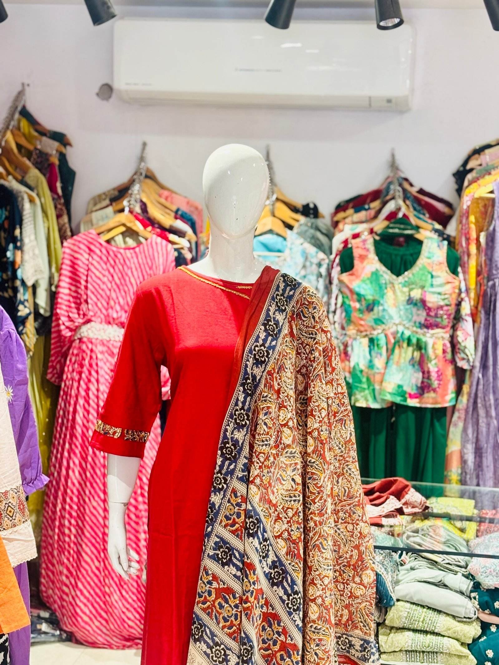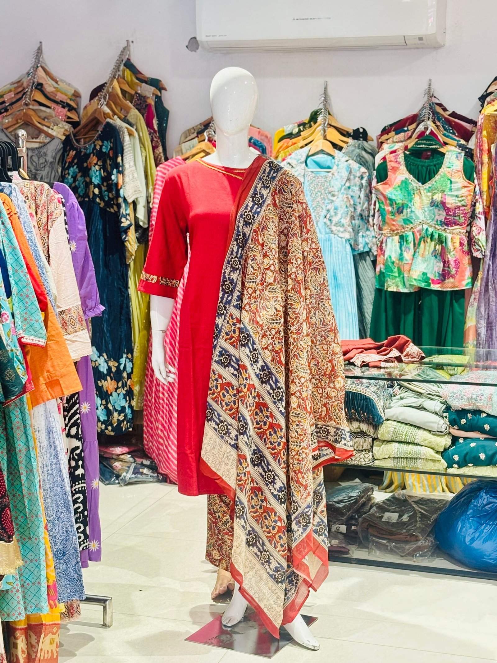 a mannequin displaying a red kurta set with a printed dupatta, typical of traditional Indian ethnic wear