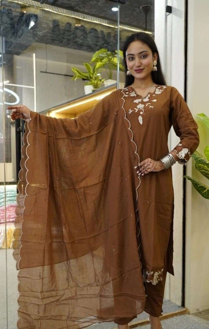 • Description: The outfit appears to be a straight-cut kurta (tunic) with matching trousers/pants and a dupatta (scarf). The fabric is likely cotton or a cotton blend, suitable for comfort and style.