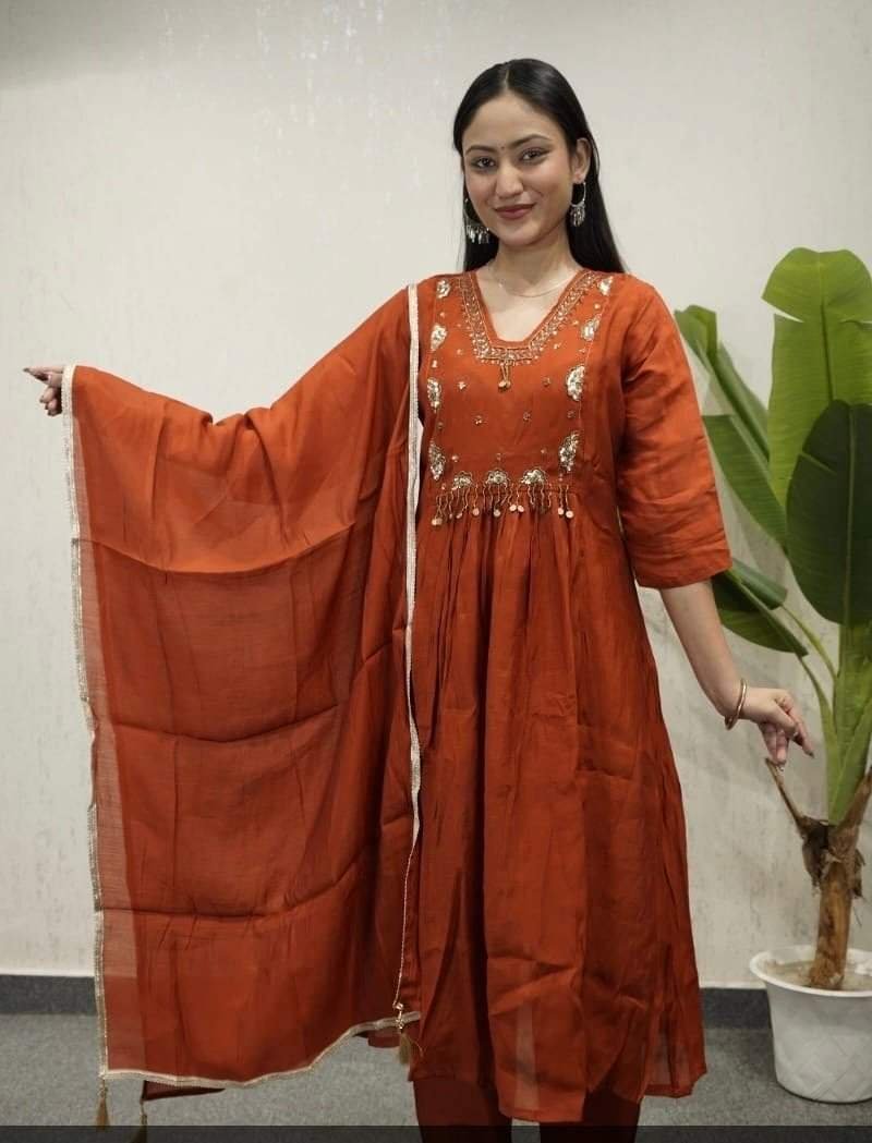 This image shows a non-celebrity person wearing a rust orange Anarkali kurta set with silver-toned embellishments and a matching dupatta. Similar outfits, often in cotton or silk blends, are widely available online for purchase.