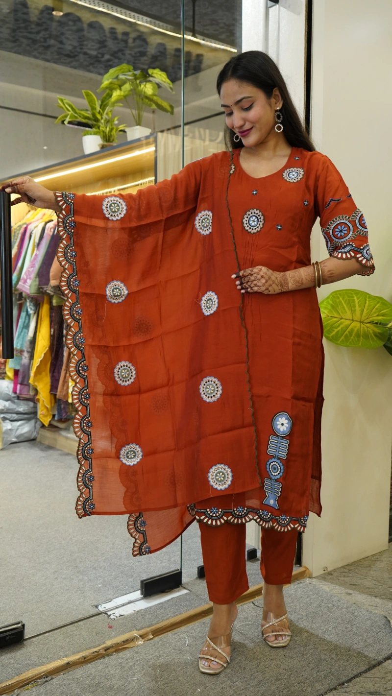 This image shows a non-celebrity individual in a stylish outfit, which is a rust orange embroidered kurta set with a dupatta. The outfit is available from various online retailers as part of their ethnic wear collections.