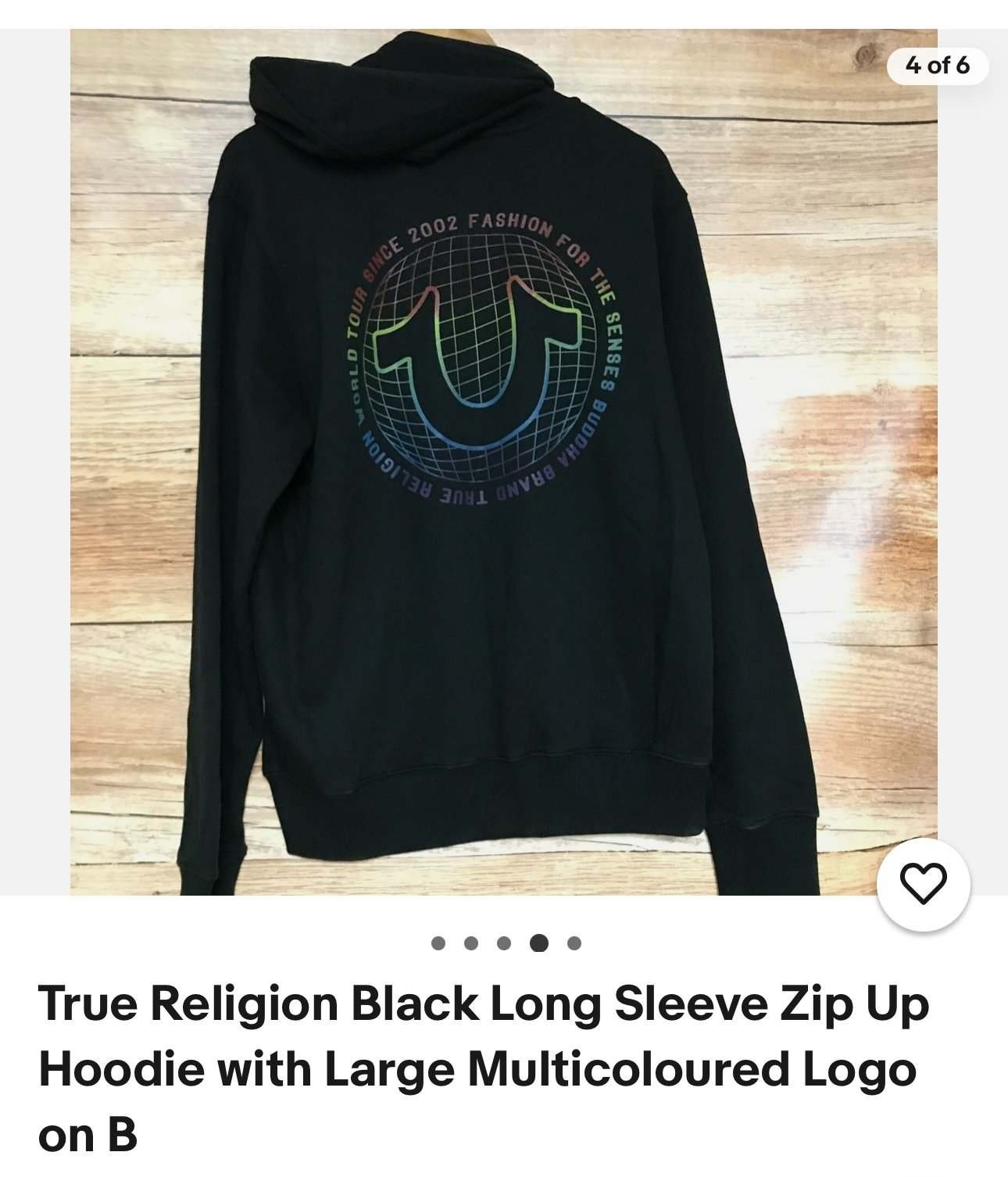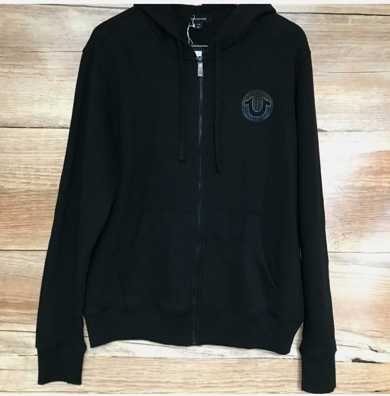 True Religion full-zip hoodie featuring an iridescent or multicolored horseshoe logo on the left chest. It is a men’s hooded sweatshirt made by the American denim and streetwear brand, True Religion.