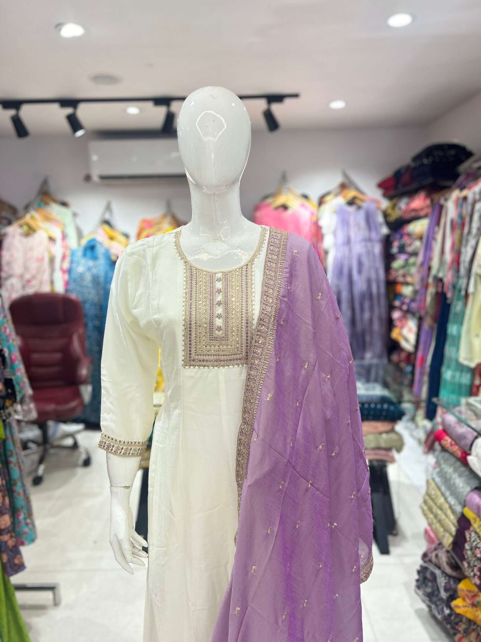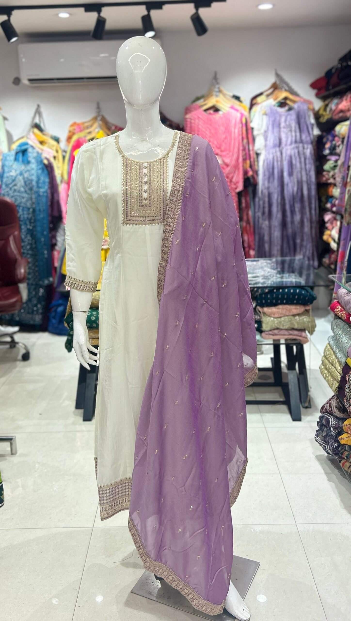 - Color: White or ivory kurta and bottom wear with a contrasting purple/lavender dupatta.
