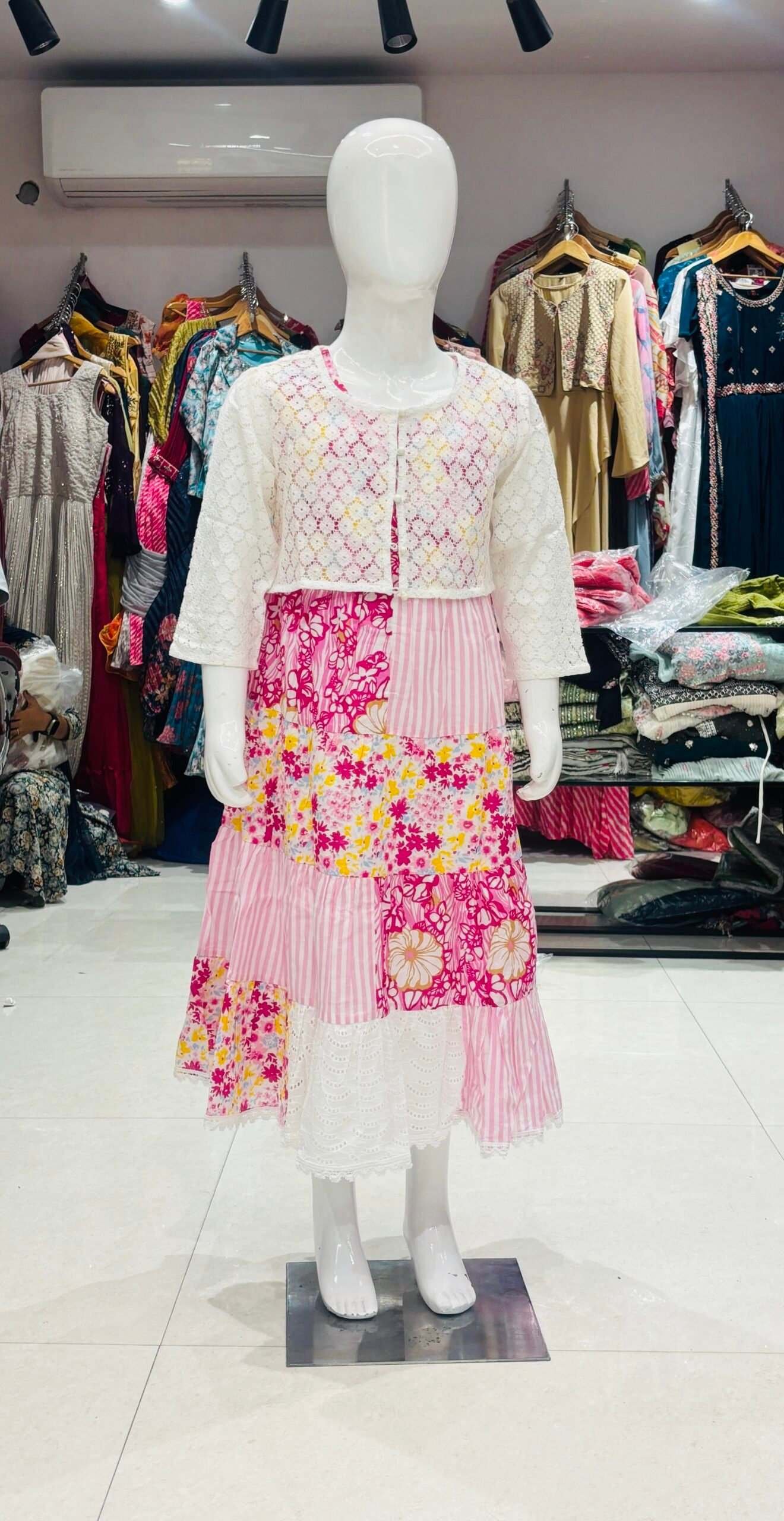 This is a girls’ ethnic wear dress set that features a tiered dress with a floral and striped pattern, paired with a white open-front shrug. The dress is often described as a maxi or A-line style, made from cotton or similar comfortable fabrics. The shrug is typically a short, cropped jacket with three-quarter sleeves and is made of lace or a textured cotton blend.