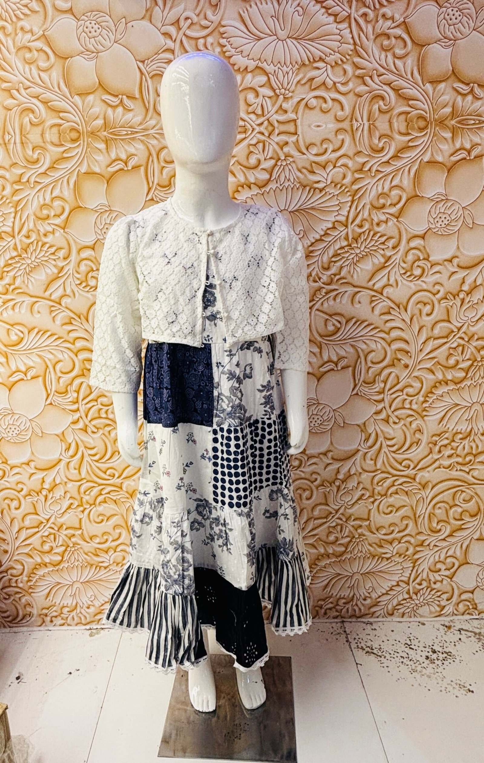 The image displays a stylish baby girl’s dress ensemble featuring a patchwork-style frock paired with a white, delicate bolero jacket, possibly designed for festive or casual wear.