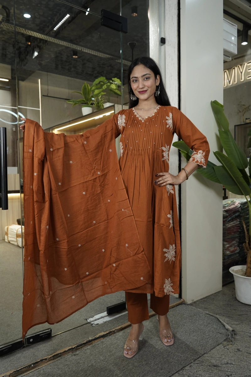 - Color: The set is a rust or caramel brown/orange color with light-colored (possibly white or beige) floral embroidery and pintuck detailing on the kurta.