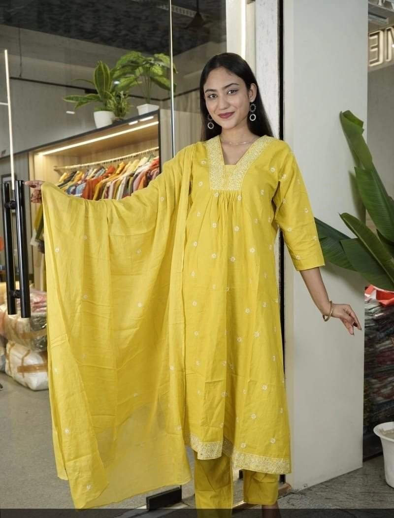 This image shows a person modeling a yellow embroidered cotton suit set. This traditional Indian outfit typically consists of a calf-length A-line kurta (tunic), matching trousers, and a dupatta (scarf).