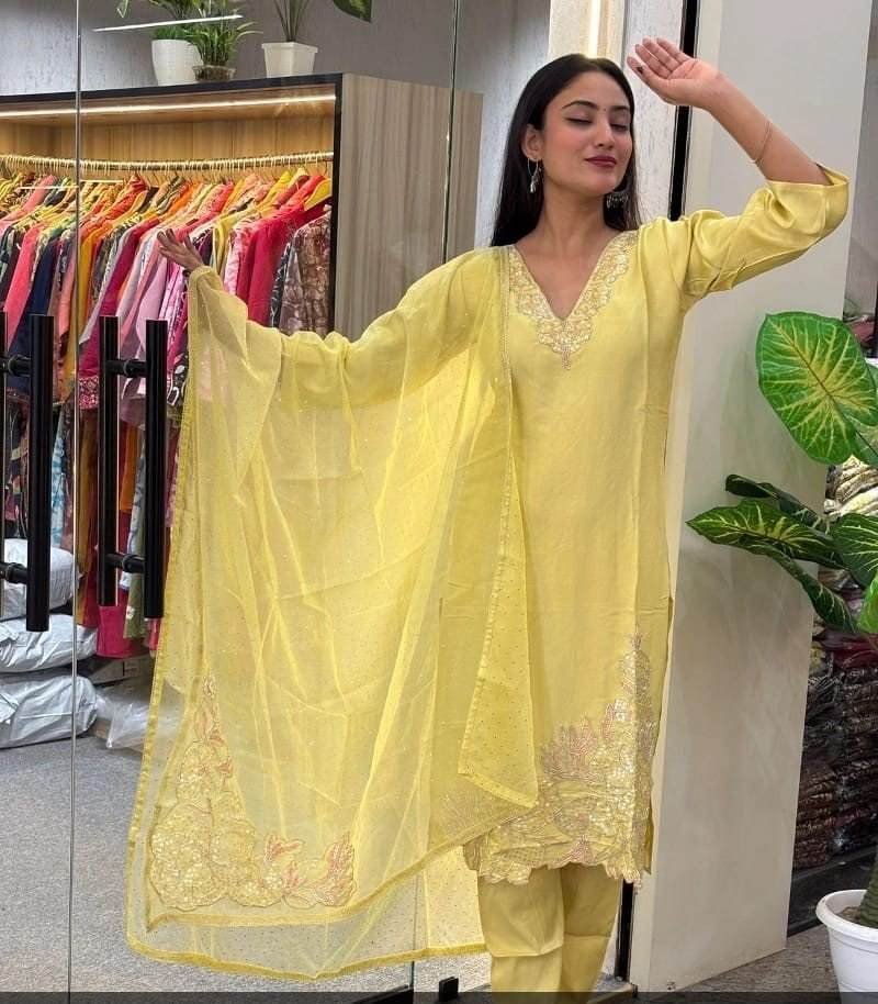 - Style: An Indian-style straight-fit kurta (tunic) and pant set, complete with a matching sheer organza or chanderi dupatta.